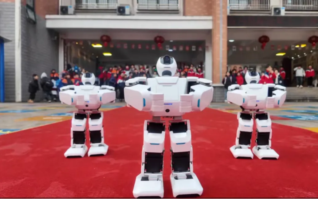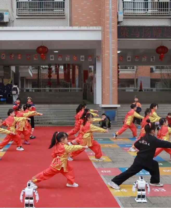 长沙县龙塘小学:3月4日,龙塘小学校园内欢呼声此起彼伏,一场别开生面的“科技+体育”主题活动火热开展,学校通过机器狗领跑、机器人与武术社团联动展演等创新形式:伴随着动感十足的音乐,几只憨态可掬的机器狗迈着整齐的步伐,与体育老师并肩前行,成为跑道上最亮眼的风景。它们灵活转身、有序随行,带领全校学生开启“阳光晨跑”第一跑。