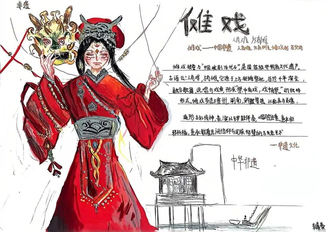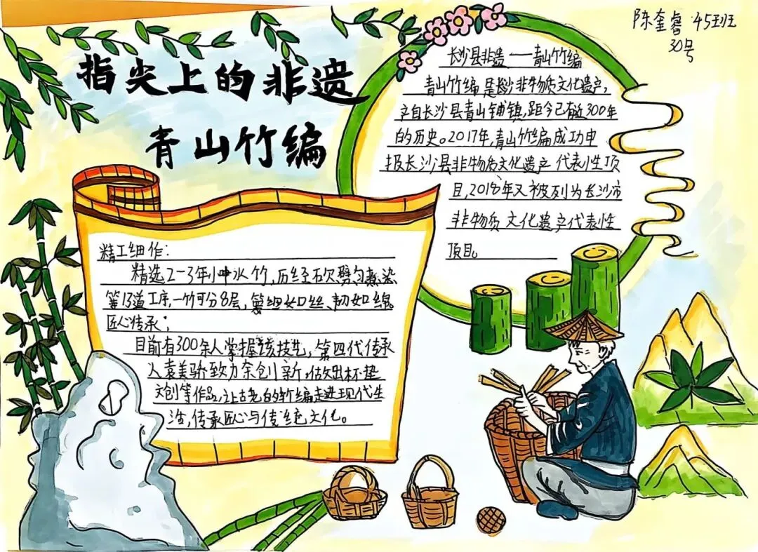 高年级队员以“非遗传承人”的身份,深入了解青山竹编、棕编、捏面人、糖画等非遗项目。同时,队员们还制作了图文并茂的非遗介绍卡片,记录非遗的历史渊源、制作工艺与文化价值,成为非遗文化的小小宣传员。