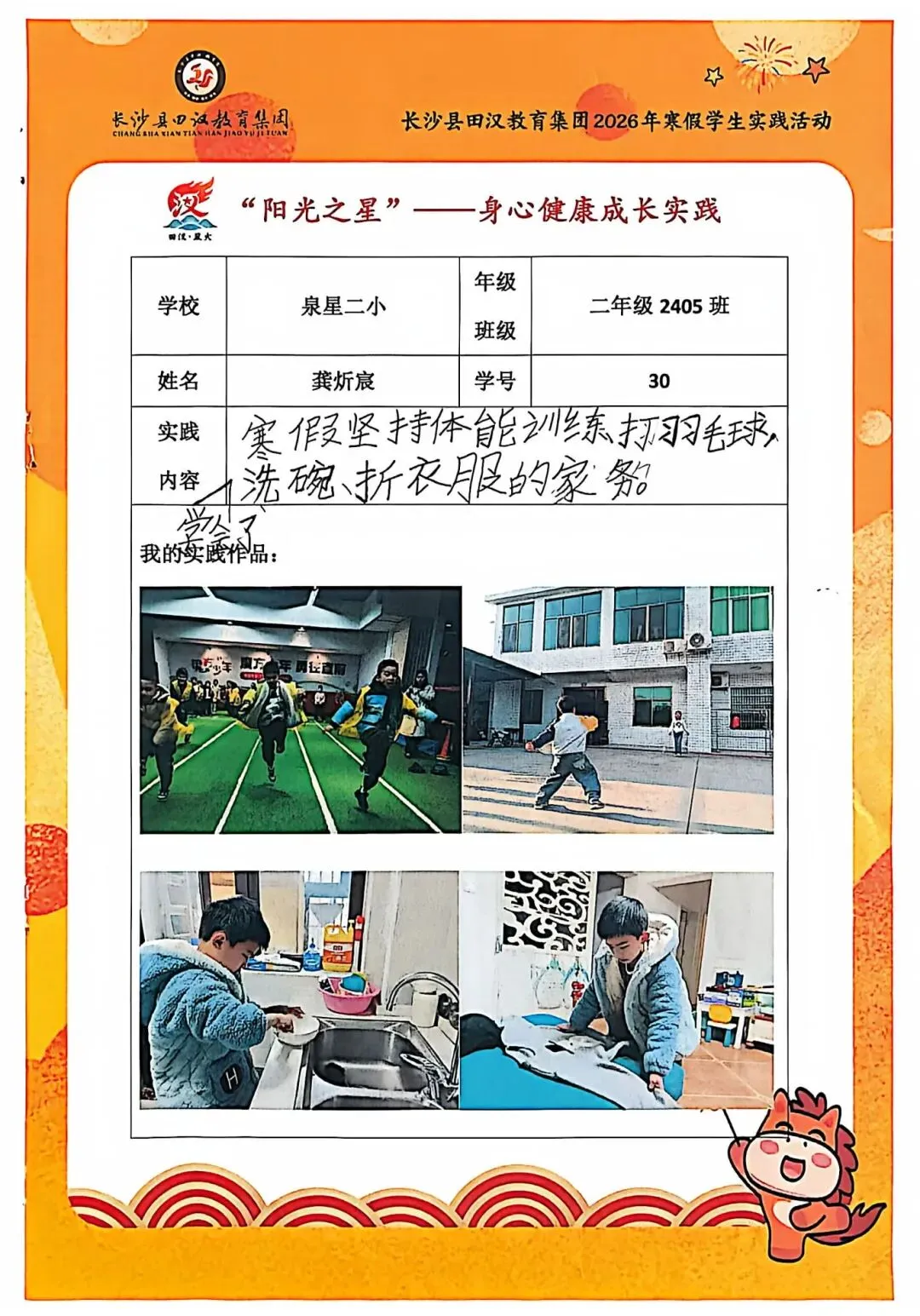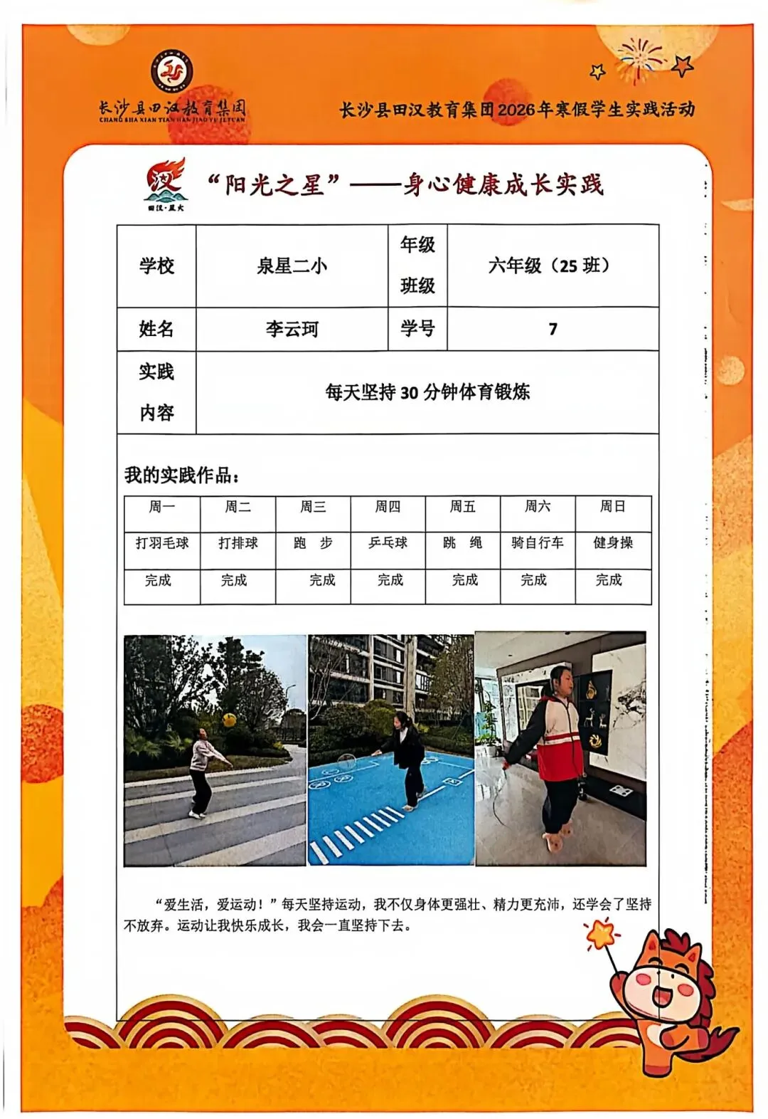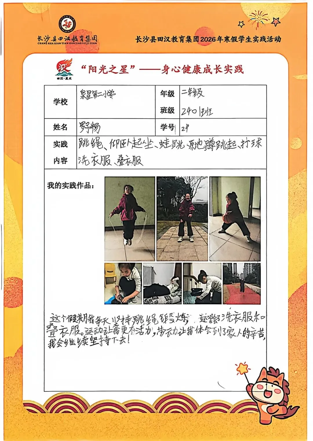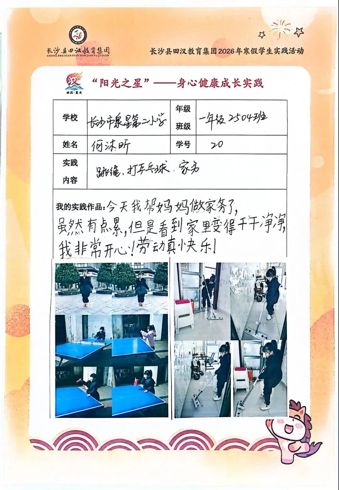低年级队员坚持每天锻炼20分钟,跳绳、跳房子、打羽毛球、骑车等成为寒假日常,在运动中收获快乐与健康。同时,他们主动学习洗碗、整理书桌、叠衣服等家务技能,用双手为家庭分担责任。