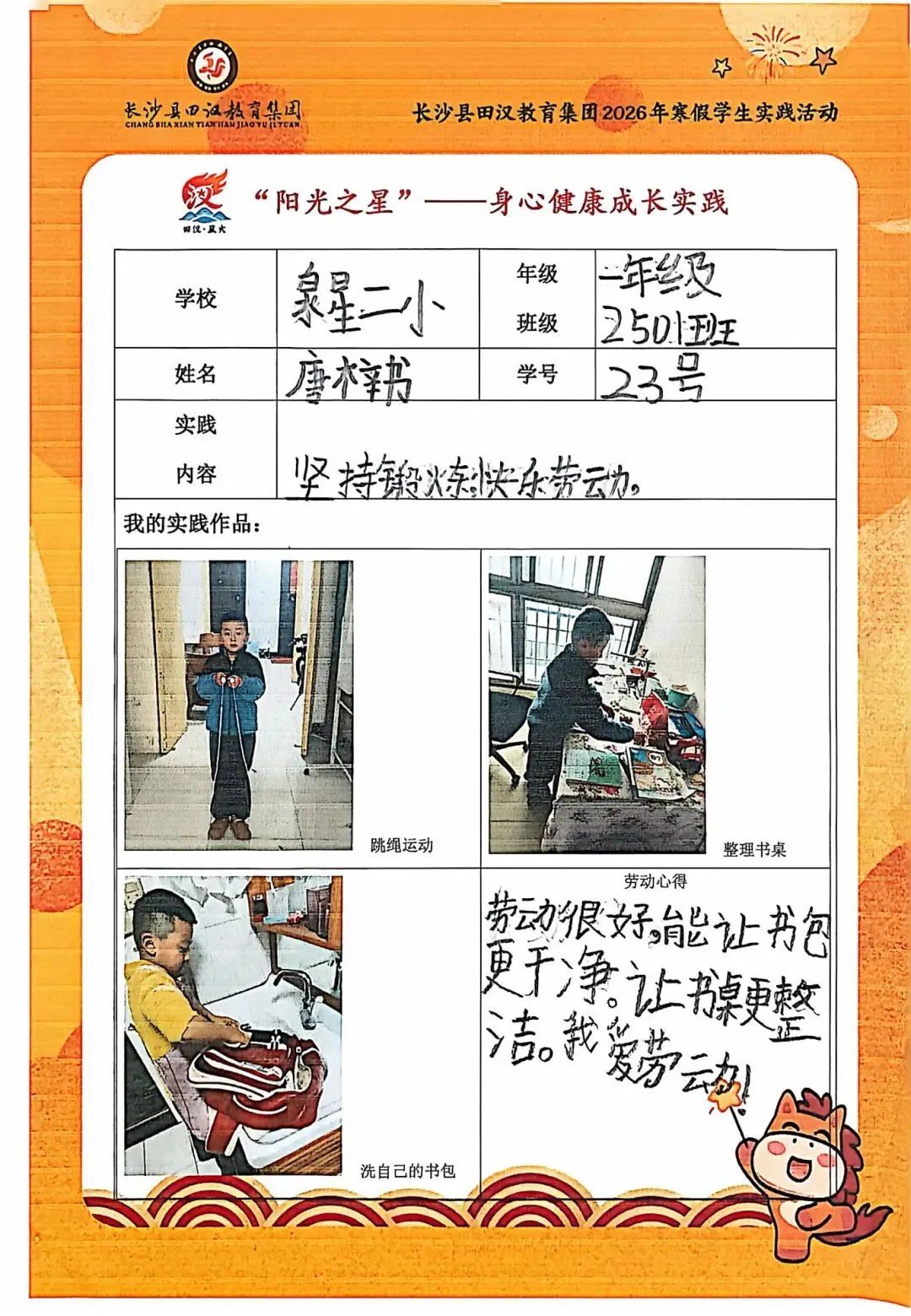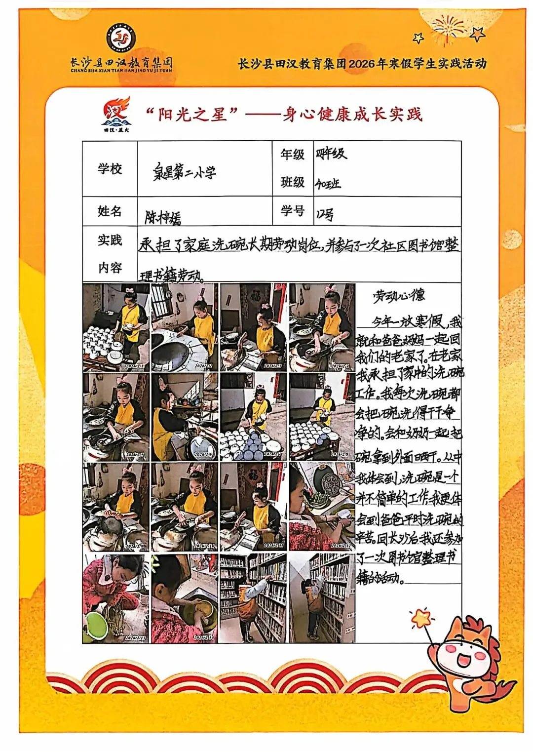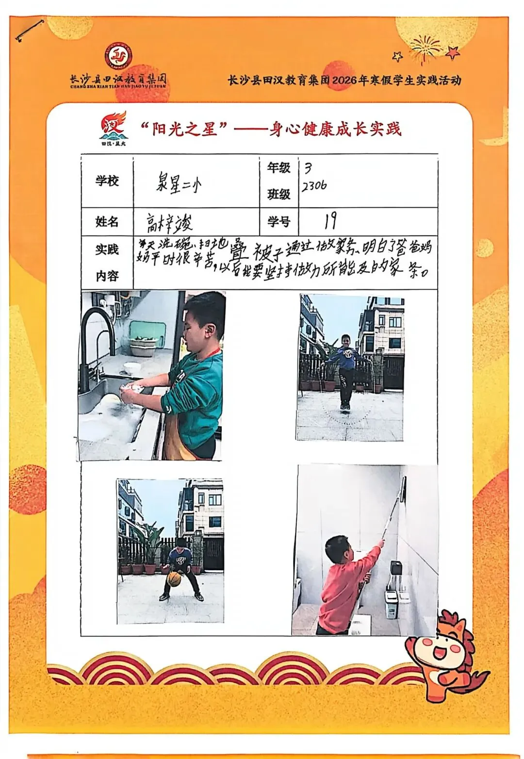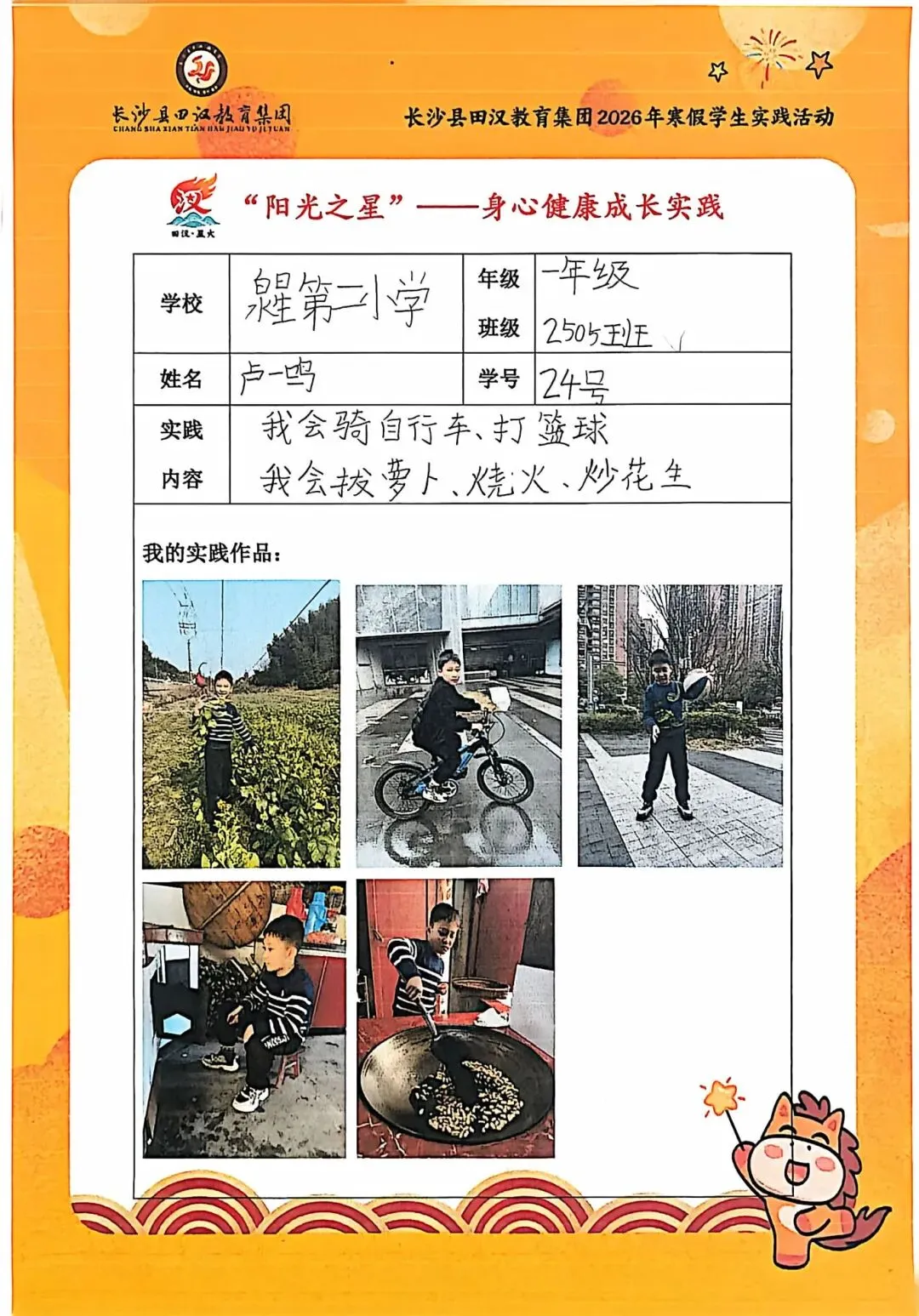 低年级队员坚持每天锻炼20分钟,跳绳、跳房子、打羽毛球、骑车等成为寒假日常,在运动中收获快乐与健康。同时,他们主动学习洗碗、整理书桌、叠衣服等家务技能,用双手为家庭分担责任。