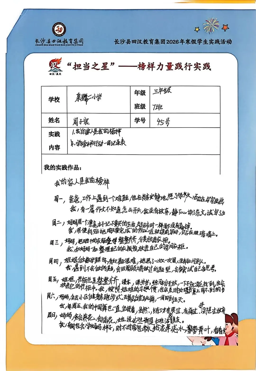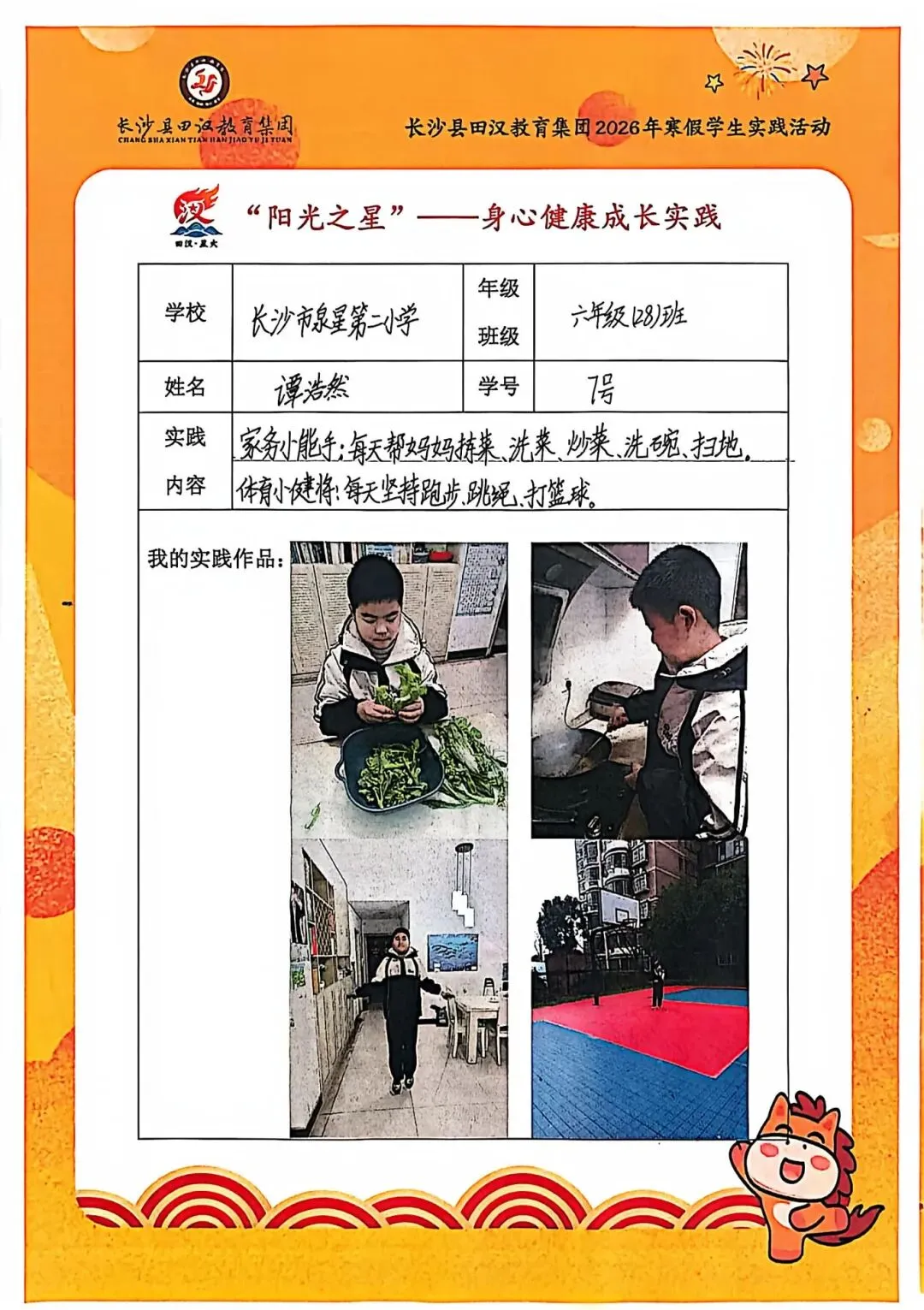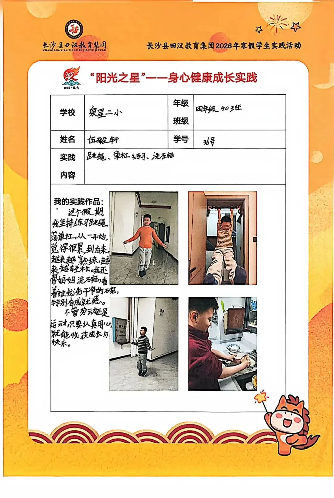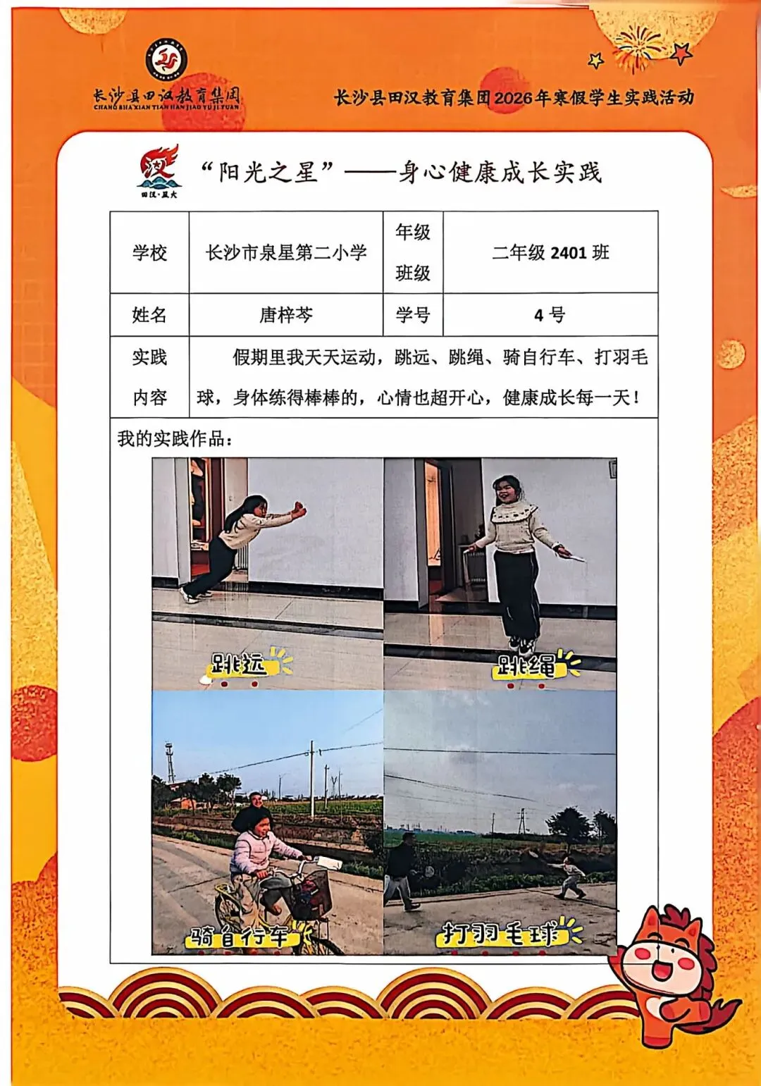 低年级队员坚持每天锻炼20分钟,跳绳、跳房子、打羽毛球、骑车等成为寒假日常,在运动中收获快乐与健康。同时,他们主动学习洗碗、整理书桌、叠衣服等家务技能,用双手为家庭分担责任。