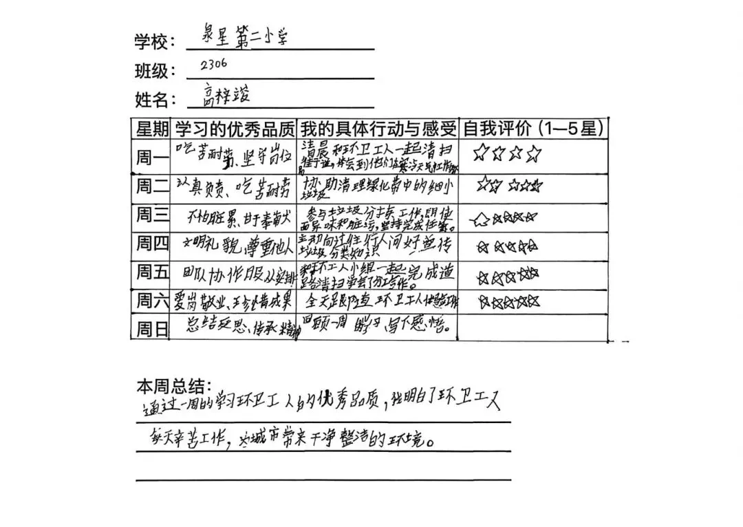 低年级队员用“发现的眼睛”寻找身边榜样,记录下环卫工人、身边家人的优秀品质,并开展了为期一周的“学榜样”行动。他们主动担任图书管理员,去到敬老院进行志愿服务,和环卫工人一起捡拾垃圾等,用实际行动践行榜样精神。