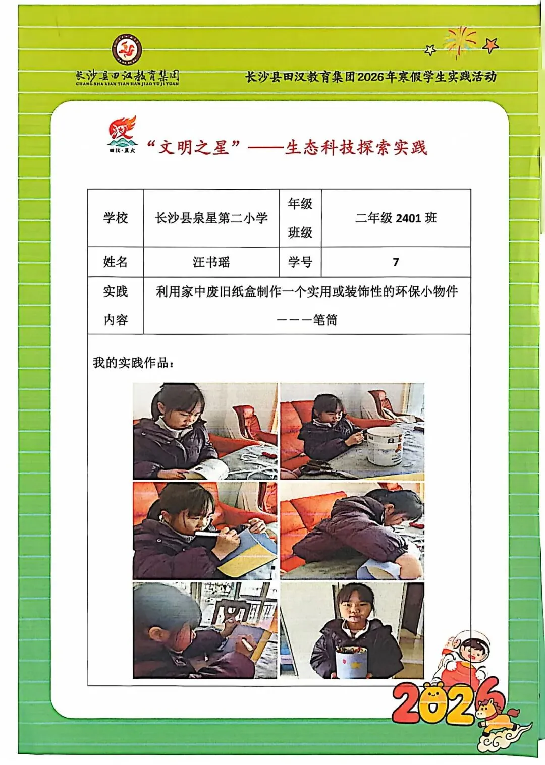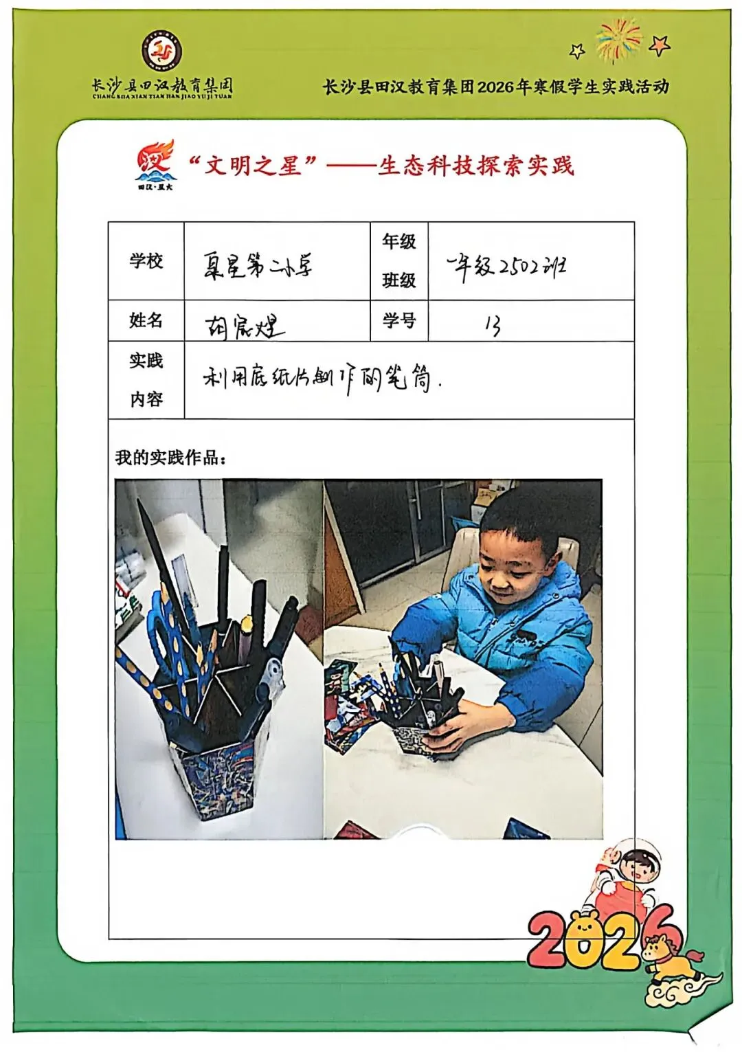低年级队员化身“环保小卫士”,利用家中废旧纸盒、塑料瓶等材料,制作出实用的笔筒、收纳盒与装饰摆件,践行“变废为宝”的环保理念。