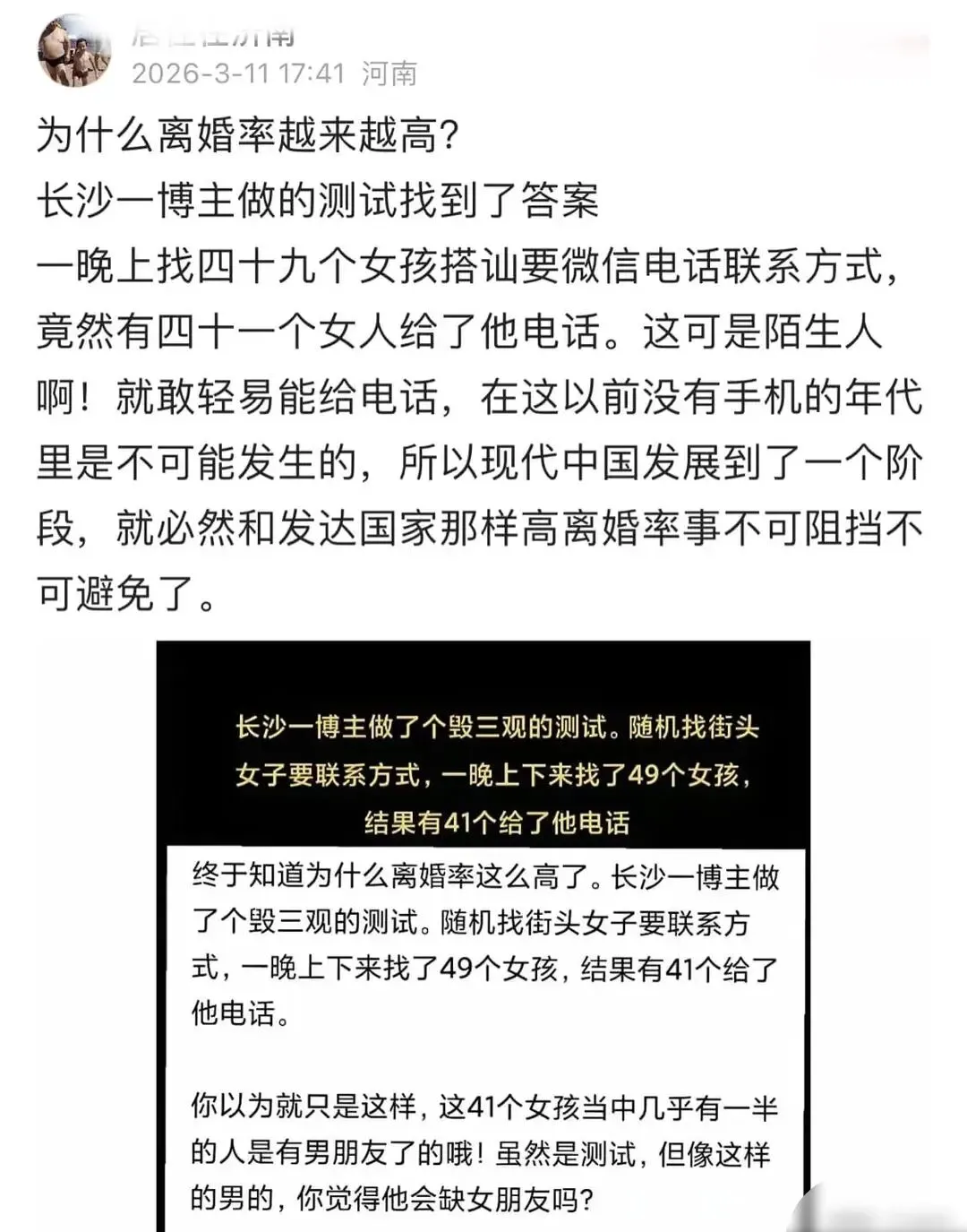 近日,有网友在网络平台上发帖称,为什么离婚率越来越高?长沙一博主做的测试找到了答案。