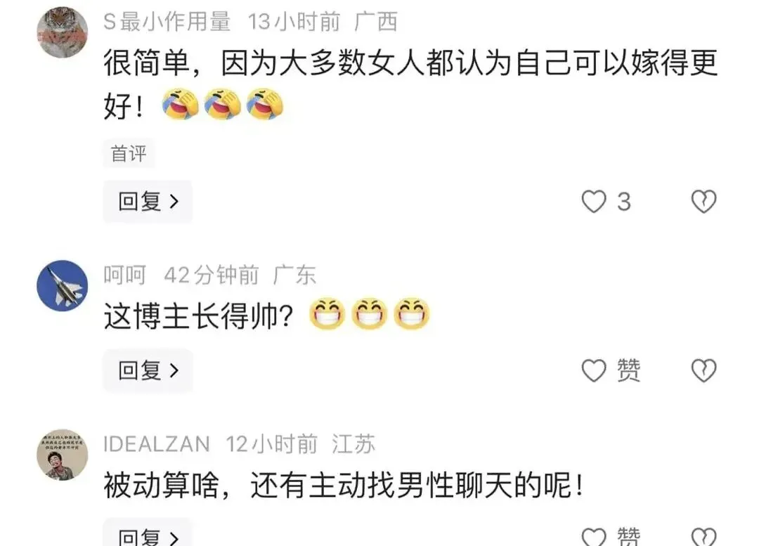 针对这一事件,网友们纷纷发表评论。有网友评论,很简单,因为大多数女人都认为自己可以嫁得更好!也有网友表示,被动算啥,还有主动找男性聊天的呢!