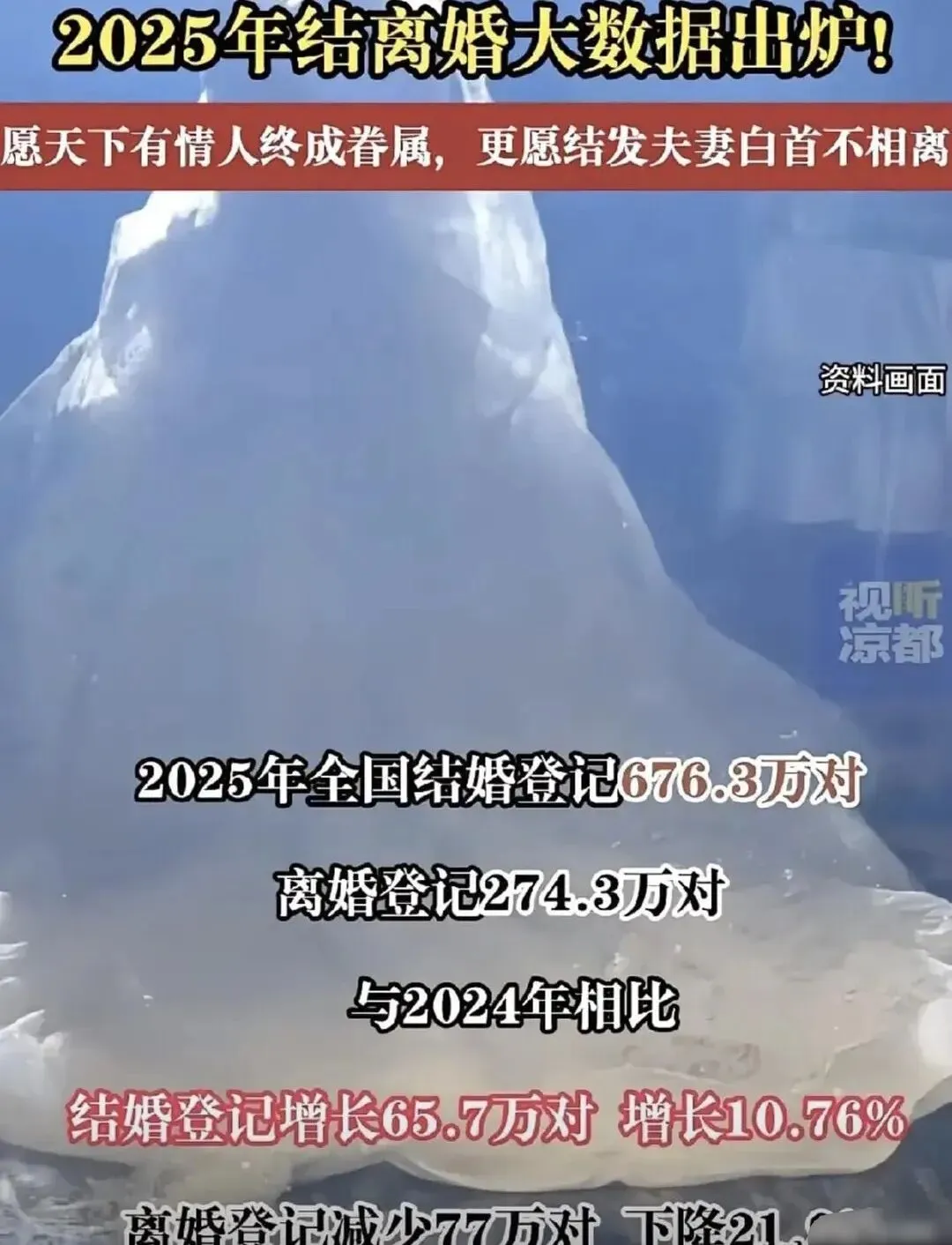 让我们来看看大数据——2025年,全国结婚登记数为676.3万对,离婚登记数为274.3万对。与2024年相比,结婚登记数增加了65.7万对,同比增长10.76%;离婚登记数减少了77万对,同比下降21.9%。