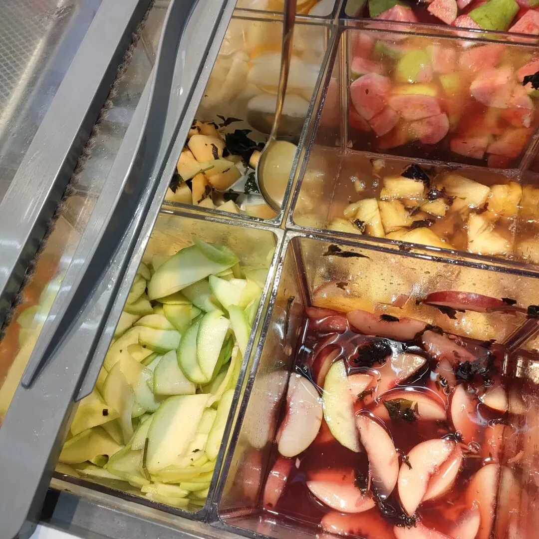 口味(个人感受):几款水果是切好和紫苏泡一起放冰箱。其中桃子是最入味的,红色芭乐没有泡到多少汁水,吃不到紫苏味。青芒也还可以,剩下的水果里吃到的还是自身味道比较重。