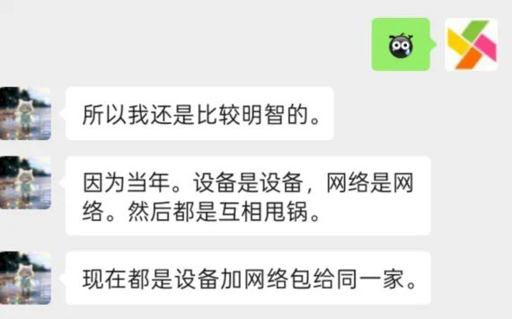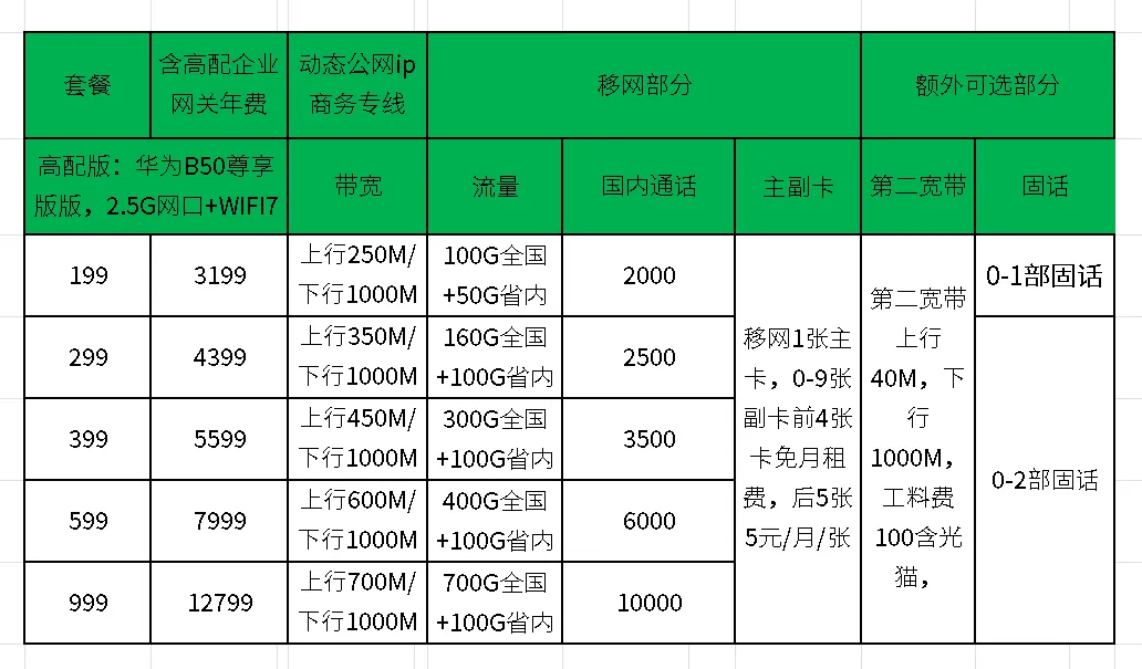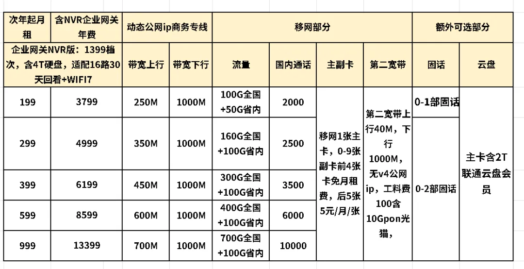公司网络经常出问题的老板都知道,当你的网络出了问题的时候,很容易碰到一个问题:找运营商的装机师傅,他们来了之后发现光猫那一段是有网的,接上下挂的交换机,内部网线,路由器等后就没有网络,就推给内网师傅了。而内网师傅维护一般是三个月就跑路了,或者超过时间后就得另购。 上图是湖南地市的一个微信好友,他跟我讲到外网和内网都是联通做的,避免了之前分开弄而互相甩锅的问题。因此,找联通做内网外网一起的好处:1,避免互相甩锅,2,开专票方便。3,运营商级别的合同,避免跑路。 其实,之前公司推出智赋万企业务的时候,就是考虑到这个把网和设备一起做的事,就是办理FTTO业务,可以办理智赋万企优惠套餐(相对于老套餐和某友商的套餐来说)。但是由于很多客户自己都有内网了,而导致FTTO设备闲置了,所以后来,智赋万企业务又可以只开一台主网关了。这本来也是一个双关的操作,首年贵一些含设备,还能防止业务员第二年再忽悠客户拆了重办。也考虑办理的时候有门槛,换网浪费了。(动态公网ip,适合办公,尤其是直播需要IP经常变避免总是同IP限权。),TCP会话数高,这是企业宽带相比家宽的最核心的区别,且有ipv4公网ip。高上行可开高清晰度,高清晰度更容易被算法推荐你的直播。可免费二宽和包含5张手机卡,最多开10张,实在是为需要注册的工作号多的公司量身定做。以199智赋万企为例,199一个月的企业宽带套餐,为了计算和开票方便,取整预存,一年就是2400.或者最低按季度缴费,600.第二年起继续199/月。 +减配企业网关499调测费一台(两年内退网要退设备,两年后不要)。4个千兆电口+WIFI6功能。或者+高配企业网关,799调测费一台,2.5G网口+2.5G SFP+4个电话口+4个千兆电口+WIFI7,整网带机量300台。 可选购从网关,减配从网关300/台,高配WIFI7从网关499/台。最多支持1主32从,企业大面积网络覆盖。 如果需要部署监控摄像头本地版本:前面的企业网关换成带NVR版本的华为B896-U6,1399一台,附带仅限用于摄像头本地存储的4T硬盘+录像机,连接HDMI线到电视,配合华为超级压缩编码可以实现16路摄像头30天回看。同理,299套餐,季度交费900+1399.按年缴费3600+1399=4999,第二年起继续299/月。 内网工位点位则约25/工位,交换机交换机调测另算。云存储摄像头则1200包3年4路400万像素的摄像头。