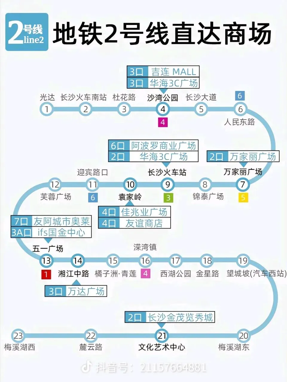 2号线(冰蓝色):梅溪湖西—光达,东西骨干,过橘子洲、长沙南站;