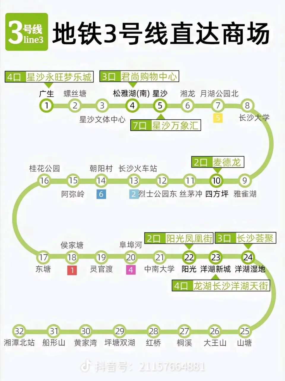 3号线(酒绿色):山塘—广生,跨湘江连接河西与星沙;