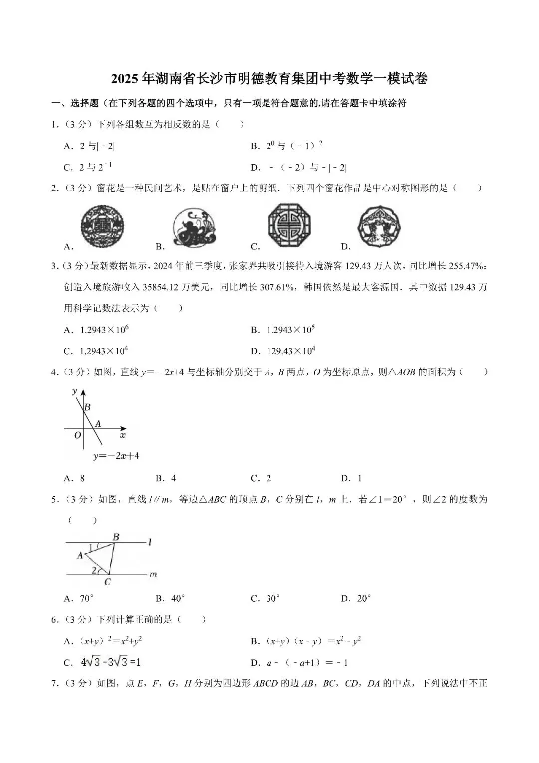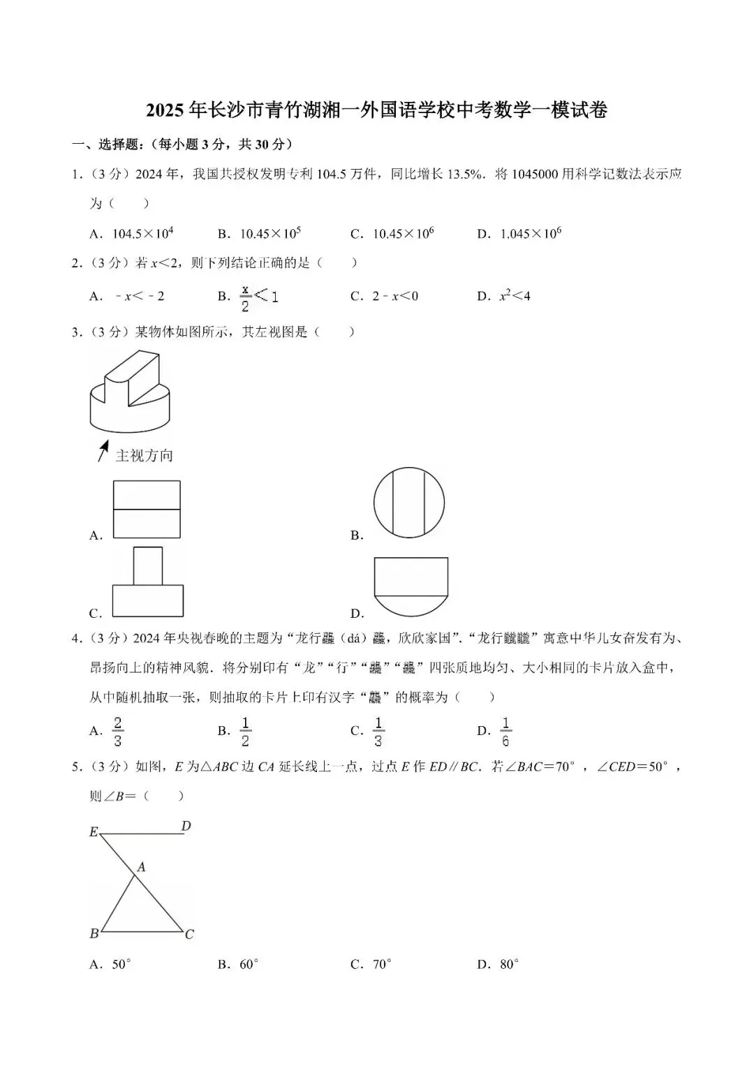 【真题汇总】——2025年长沙九年级下册第一次数学检测试卷+参考答案(免费领取)