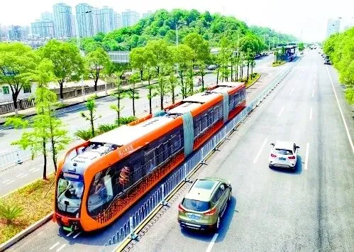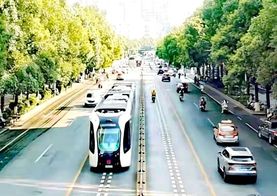 智轨列车依靠虚拟轨迹追踪与智能控制技术,自动导向、路面行驶,3节编组列车可承载300人,堪称“马路上的小型地铁”。
