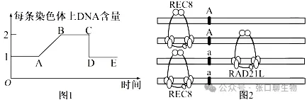 3. 图1为某哺乳动物(2N)细胞分裂过程中每条染色体DNA含量变化曲线,图2为减数分裂过程中出现的黏连复合蛋白(REC8和RAD21L),黏连复合蛋白可以影响分裂过程中染色体的行为。下列叙述错误的是( )