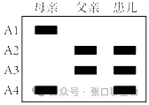 4. 为了分析某13三体综合征患儿的病因,对该患儿及其父母的13号染色体上的A基因(A1~A4)进行PCR扩增,经凝胶电泳后,结果如图所示。关于该患儿致病的原因叙述错误的是( )