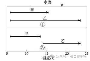 6. 下图①为两种涡虫分别生活时,沿溪流温度梯度的分布情况;图②为两种涡虫共同生活时,水流沿溪流温度梯度的分布情况。下列相关叙述错误的是( )