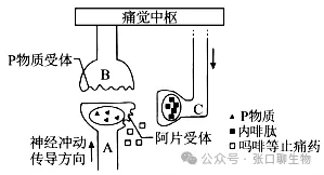 C. 据图推测,吗啡可与P物质受体结合,进而影响B神经元的功能,发挥镇痛作用