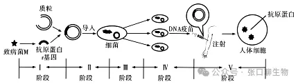 【解析】制备的疫苗注入人体后不能引起人体患病,但是又要具有抗原性的特点,因此推测图中所示抗原蛋白基因最可能是致病菌M的特有不致病基因,A错误;图示某种DNA疫苗的制备与使用过程,其中Ⅰ表示从病菌或病毒中获取目的基因和质粒构建基因表达载体,需要使用DNA连接酶,Ⅱ表示将目的基因导入受体菌细胞,需要使用Ca²⁺处理,Ⅲ表示受体菌的扩增过程,Ⅳ表示筛选含有目的基因的受体菌,Ⅴ为基因疫苗的注射以及在人体细胞内表达出抗原蛋白的过程,B错误;基因表达包含了转录和翻译,抗原蛋白r和抗r抗体属于两种不同的蛋白质,由不同的基因转录,故基因所来源的物种、转录出的mRNA碱基序列、翻译出的氨基酸序列都不同,但翻译时 tRNA所来源的物种相同,C错误;DNA疫苗以核酸形式进入人体,在人体细胞内表达出相应的抗原蛋白,刺激机体发生特异性免疫,包括体液免疫和细胞免疫的过程,D正确。故选D。