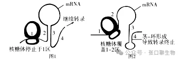 14. 色氨酸合成酶基因的mRNA中调控该基因表达的序列包含4个区段,其中1区段富含编码色氨酸的密码子。当细胞中色氨酸含量较低时,核糖体在mRNA上移动速度较慢并停止于1区,此时2、3区配对,基因继续转录,如图1所示。当色氨酸充足时,核糖体覆盖于1~2区,则3、4区配对形成一个阻止mRNA继续合成的茎-环结构,阻止基因的转录,如图2所示。下列说法错误的是( )