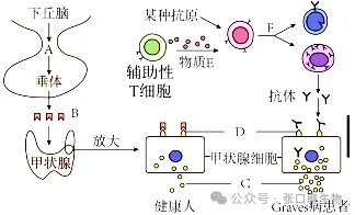 【解析】从免疫学角度分析,患者“敌我不分”地将自身物质当作外来异物进行攻击而引起的疾病称为自身免疫病;Graves病是患者所产生的某种抗体与促甲状腺激素的受体结合,使甲状腺细胞持续激发,产生高水平的甲状腺激素所致,A正确;产生抗体的是浆细胞,所以F代表B细胞增殖、分化为记忆细胞和浆细胞的过程,B正确;人体长期缺碘会导致甲状腺肿(大脖子病),与Graves病患者相比,大脖子病患者由于缺碘导致甲状腺激素合成、分泌不足,反馈调节下丘脑和垂体的抑制作用较弱,从而使得A(TRH)、B(TSH)的含量偏高,而Graves病患者由于甲状腺激素较多,反馈调节下丘脑和垂体的抑制作用增强,从而使得A(TRH)、B(TSH)的含量偏低,C错误;Graves病患者C(甲状腺激素)比正常人的分泌量更多的主要原因是患者体内的抗体起着与促甲状腺激素类似的功能,使甲状腺机能增强,D正确。故选ABD。