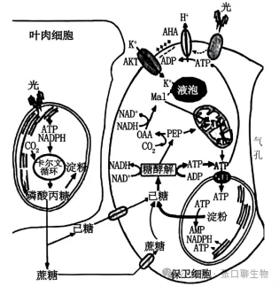 (4)叶肉细胞光合作用产生的蔗糖,运输到保卫细胞后水解,产物参与合成苹果酸;苹果酸进入保卫细胞的液泡,提高细胞液浓度(渗透压),使保卫细胞吸水膨胀,促进气孔打开。蔗糖水解后的产物在保卫细胞中氧化分解,产生ATP;ATP 为质子泵(AHA)提供能量,将 H⁺运出膜外,形成跨膜电化学势能梯度,驱动 K⁺等离子进入细胞,增大细胞液浓度,促进保卫细胞吸水、气孔打开。