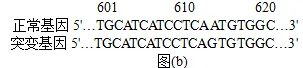 (2)分析图(b)表示该基因编码序列(与模板链互补),正常基因和突变基因的第614位碱基不同,由A变为G,由其指导合成的mRNA上3个相邻碱基编码一个氨基酸,故对应的氨基酸序列是614/3≈205位氨基酸发生变化,编码序列的变化为由AAT→AGT,模板链上则是由TTA→TCA,对应的密码子变化由AAU变为 AGU,即天冬酰胺变为丝氨酸。