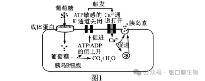 图1显示,血糖升高后,ATP敏感的K⁺通道关闭,触发Ca²⁺通道打开,需要两种通道协调,A正确;ATP/ADP值上升作为信号(信息分子),调控通道开闭,B正确;图1中Ca²⁺促进囊泡运输和胰岛素分泌,C正确;胰岛素的合成(蛋白质合成)和分泌(胞吐)均需消耗ATP,D错误。故选ABC。