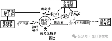 (4)糖尿病的病因常见的有两种,一种是患者体内缺乏胰岛素(称为1型糖尿病),另一种是患者体内胰岛素并不缺乏,而是靶细胞膜上接受胰岛素的受体缺乏或异常(称为2型糖尿病)。图2中抗体1、抗体2、抗体3导致的糖尿病类型分别为。
