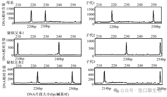 (2)据图可知,母本的DNA片段大小为220bp和230bp,父本2的DNA片段是226bp和250bp,图中子代1的DNA是220bp(与母本相同)和250bp(与父本2相同),说明子代1为两者子代且没发生突变;图中子代2的DNA片段是230bp(与母本相同)和254bp(与父本2中250bp的相近,可能发生突变,增添4个碱基),由于基因突变的频率较低,因此,子代1和子代2是母本与疑似父本2的后代。彻底水解SSR(DNA片段)将得到脱氧核糖、磷酸分子、4种碱基,共6种小分子。
