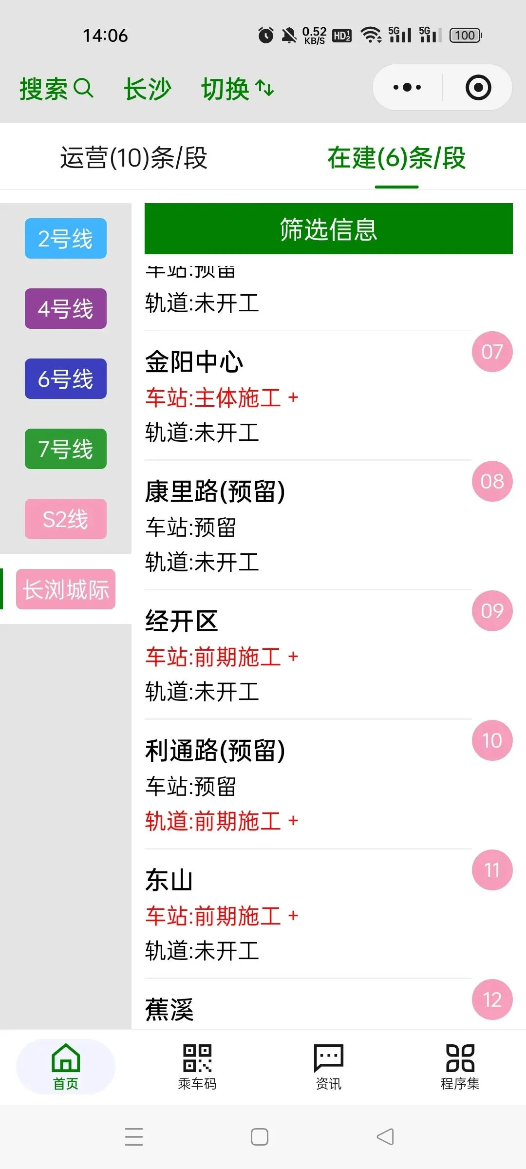长浏城际(黄花机场T3-关口),计划开通时间:2029年。13座9地下:7 高架:6)车站中,3座土建施工,其中2座基坑挖掘中,1座主体施工,10座前期准备,其中8座未围蔽,2座前期施工;38个轨行区间中,2个土建施工,36个前期准备。蕉溪车辆段未围蔽、关口车辆段未围蔽。