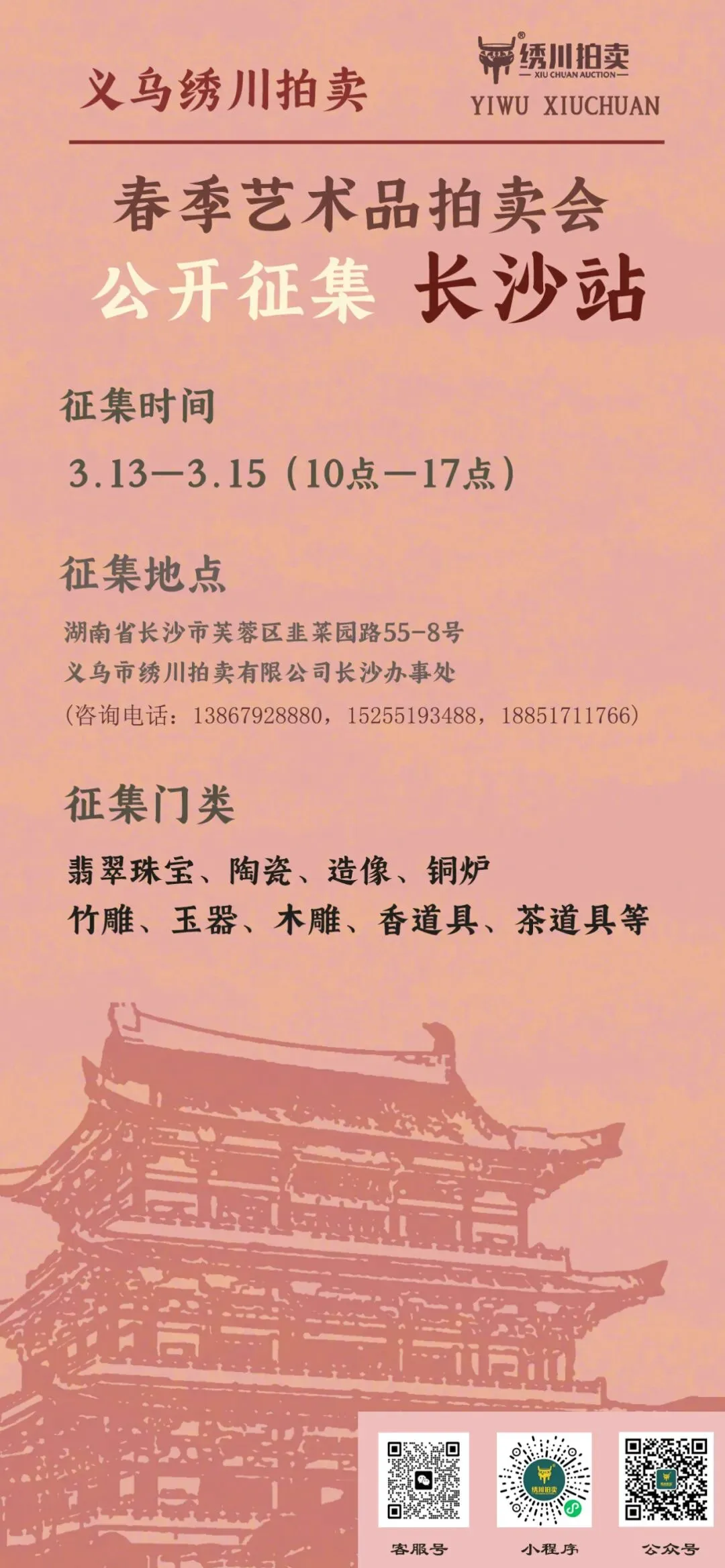 征集地点:湖南省长沙市芙蓉区韭菜园路55-8号 (义乌市绣川拍卖有限公司长沙办事处)