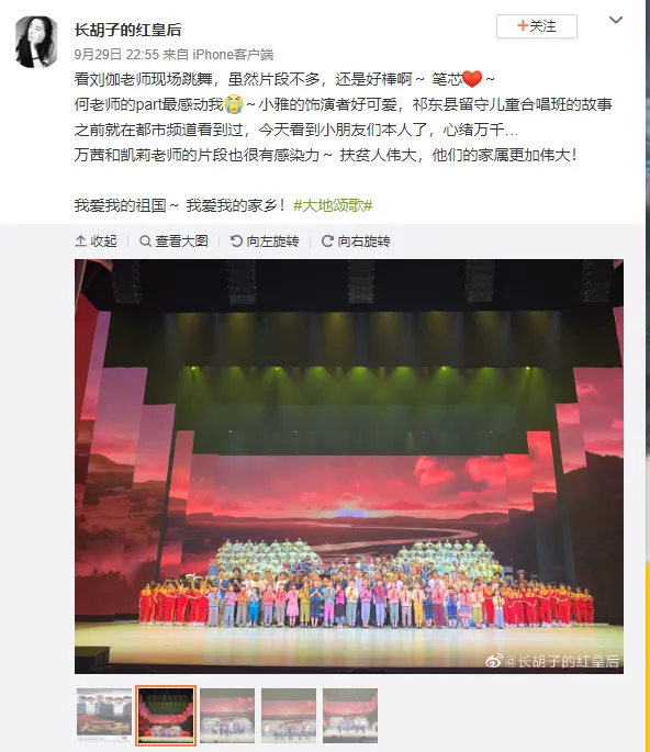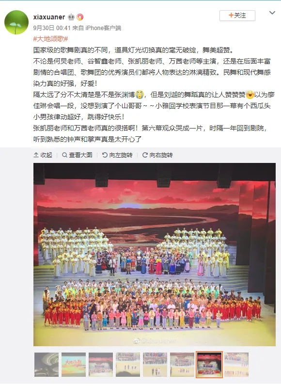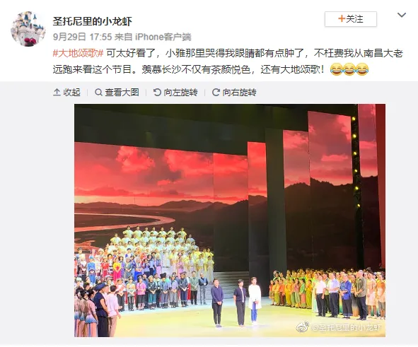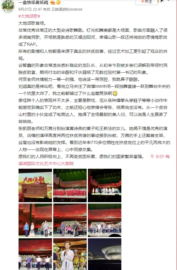 还有在梅溪湖大剧院里,刚刚参演脱贫攻坚主题大型史诗歌舞剧“大地颂歌”的谷智鑫等200多名演员聚在舞台中央,在剧中扮演“小雅”的小演员余梓溪领唱下,齐唱经典爱国歌曲“我的祖国”,集中抒发三湘儿女脱贫攻坚、强国富民的决心意志。演员们表示,《大地颂歌》和《我的祖国》表达的是同一个爱国主题,希望把剧中、歌声中对祖国的热情和挚爱一直传唱下去。