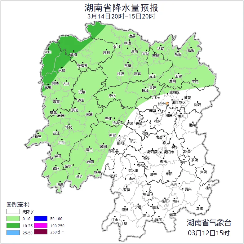 14日晚至15日白天,受低槽和西南暖湿气流影响,降雨逐渐发展,湘西、湘北有小到中雨。