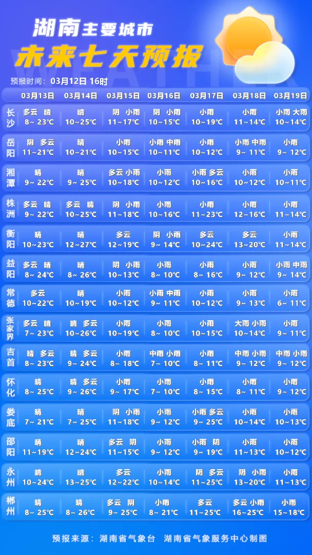 3️⃣14日晚上至15日白天:湘西、湘北阴天有小到中雨,其他地区多云间晴天;
