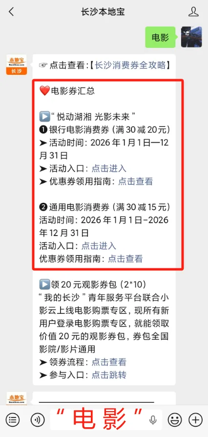 直接领取入口,在【长沙本地宝】后台聊天框回复【电影】,即可直接获得领券入口啦!