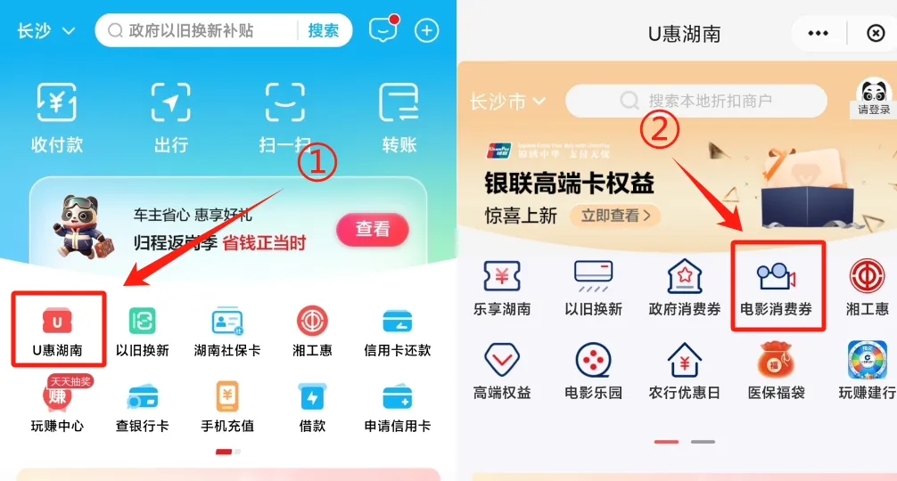 云闪付app-u惠湖南-电影消费券活动专区,或云闪付首页。
