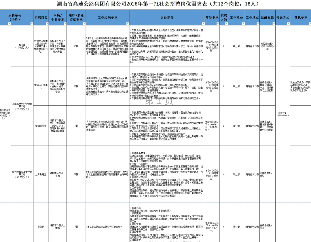 本次招聘人数共16人,具体招聘单位、岗位、人数、条件详见《湖南省高速公路集团有限公司2026年第一批社会招聘岗位表》。