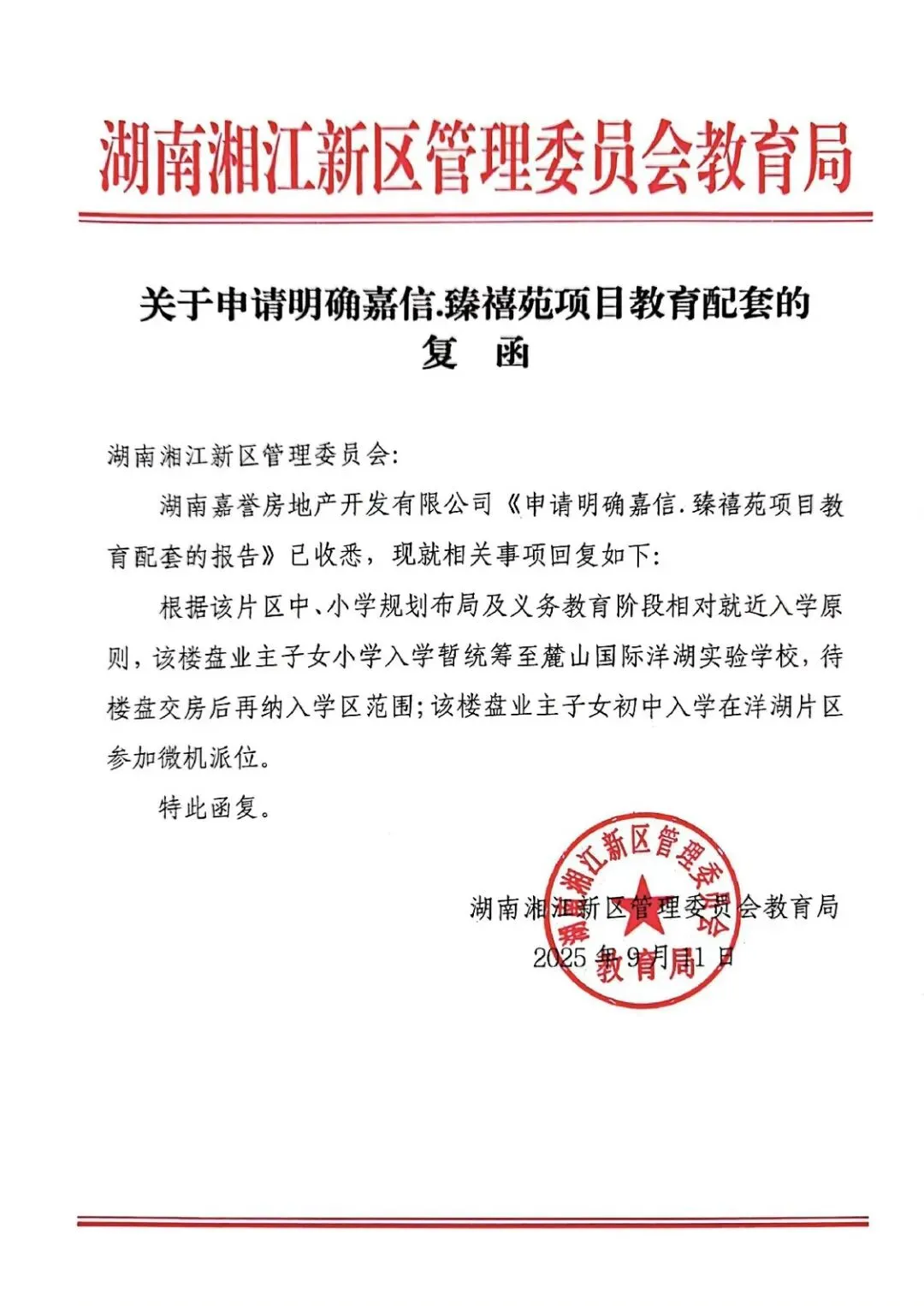 据湘江新区教育局红头文件,嘉信央玺小学阶段暂统筹入麓山国际洋湖实验学校(公办九年一贯制),交付后正式纳入学区划分。