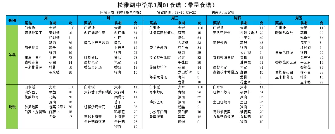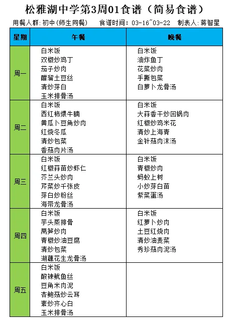 >【每周食谱】| 长沙市松雅湖中学2026年上学期第3周食谱