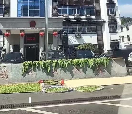视频显示,镇政府前坪上,圆圆的簸箕一个挨一个,里面是切碎了的咸菜。在镇政府正门口的旗杆下,整颗的大头菜直接铺在地上。