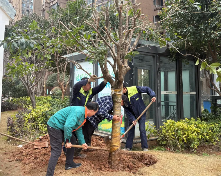 活动当天,刚上班的勤劳的绿化师傅们就已经忙碌起来了,他们分工合作,挖坑,扶树,培土,浇水。。。每个环节都一丝不苟。师傅们不仅补种了新的大树,还对园区的草坪和绿篱进行了精心的修剪。