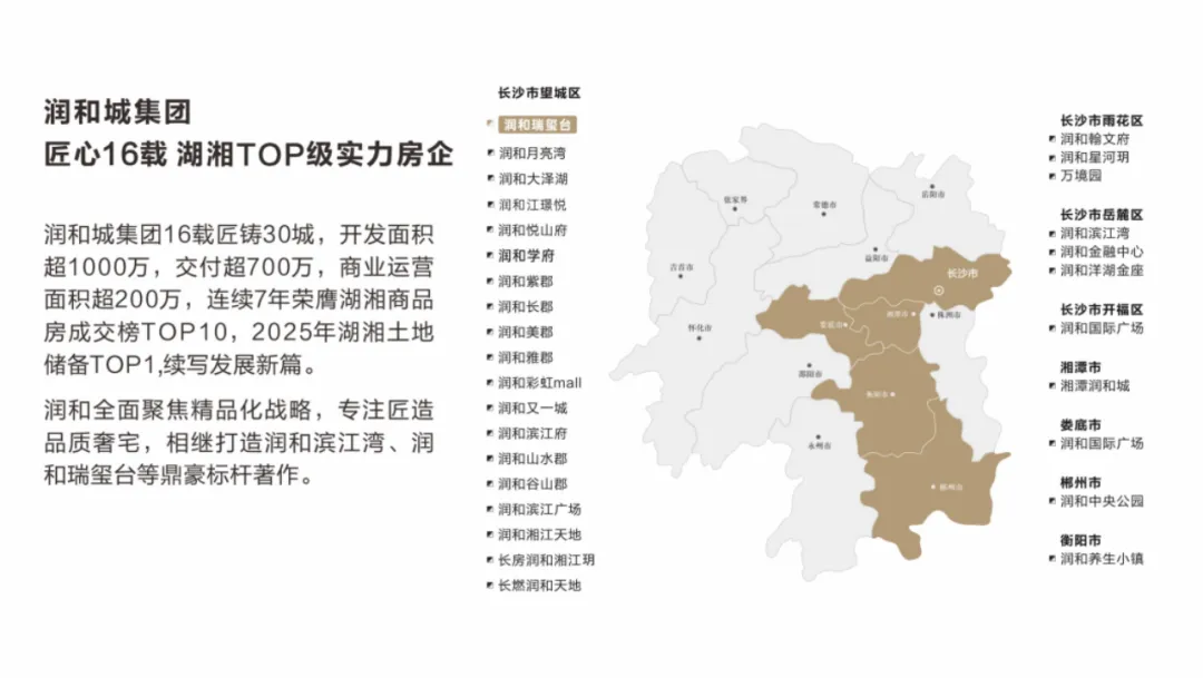 在湖南,润和城集团的名声早已打响。本土知名开发商,16年砥砺前行,打造出了润和滨江湾、润和湘江天地、润和大泽湖、润和瑞玺台等标杆作品,从产品设计到施工工艺,每一个环节都精益求精,不断引领长沙高端人居迈向新高度。