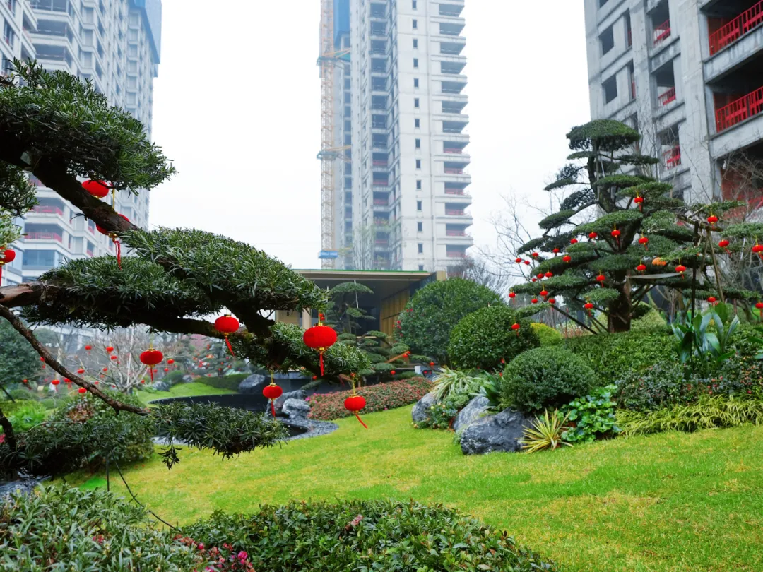 园中气度不凡,不计成本全冠移植罗汉松、金弹子等名贵成树,苍劲枝干自带岁月风骨,四季常绿、寓意吉祥。