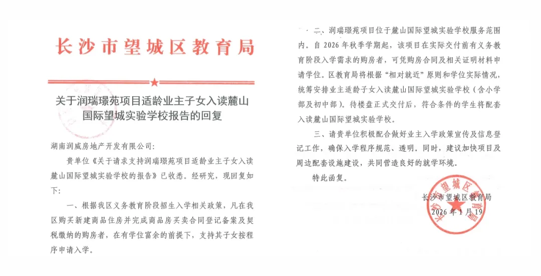 润和瑞玺台划入麓山国际望城实验学校,公办九年一贯制,有教育局红头文件,业主子女入学无忧,家门口享受一站式成长。
