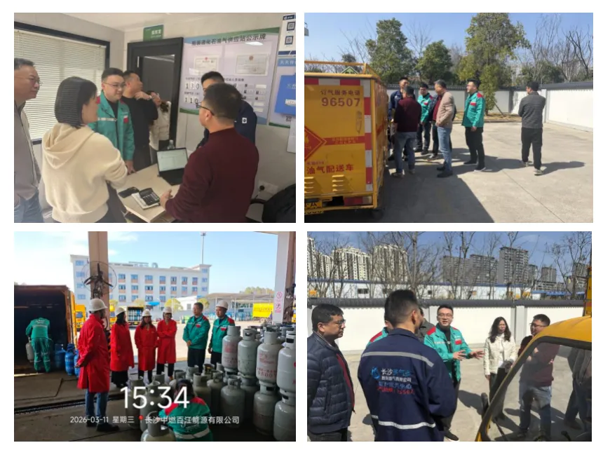 2026年3月11日,郴州市城管局考察团在郴州市市政公用设施维护服务中心副主任刘虎带领下,一行7人莅临长沙中燃百江,深入交流燃气安全管理工作。考察团先后走进百江河东片区东岸二级供气站、明月村储备站,全方位实地观摩液化石油气行业整合的“长沙模式”实践成果。