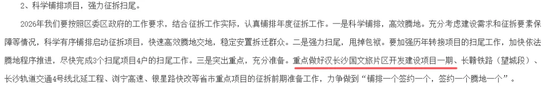 3月初,望城区发布的2025年总结及2026年度计划报告中,在提升城市功能品质这一个大类中,第一个点名提到的项目就是长沙国考古遗址公园,工作内容是推进项目征迁腾地工作。