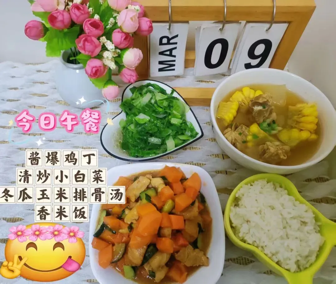 酱爆鸡丁、清炒小白菜、冬瓜玉米龙骨汤、香米饭