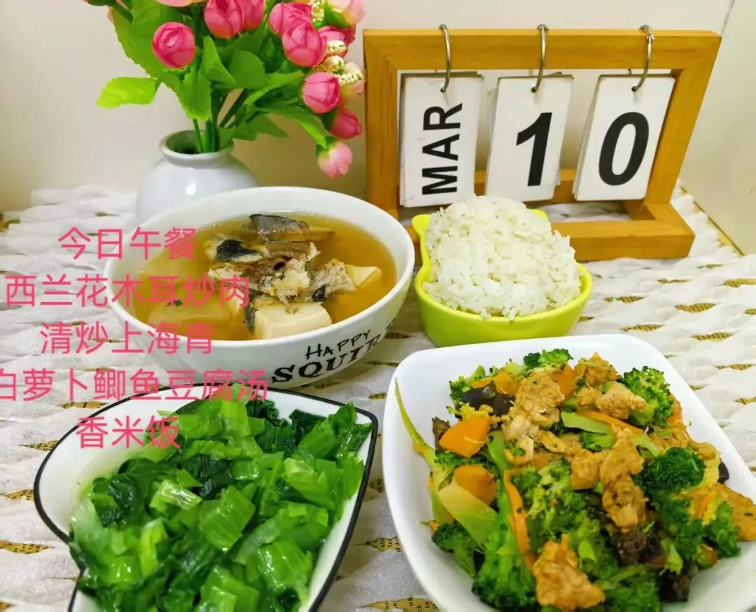 西蓝花木耳炒肉、清炒上海青、鲫鱼豆腐汤、香米饭