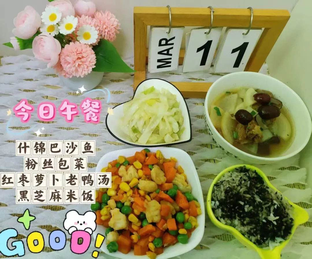 什锦巴沙鱼、粉丝包菜、红枣白萝卜老鸭汤、黑芝麻米饭