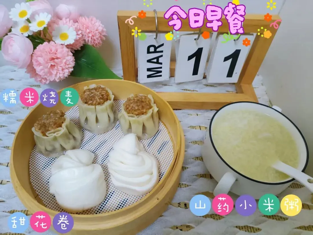 甜花卷、糯米烧麦、山药小米粥