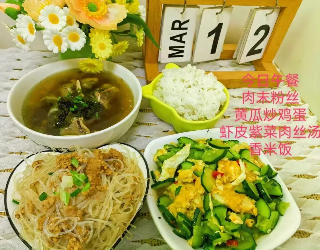 肉沫粉丝、黄瓜炒鸡蛋、海虾皮紫菜肉丝汤、香米饭